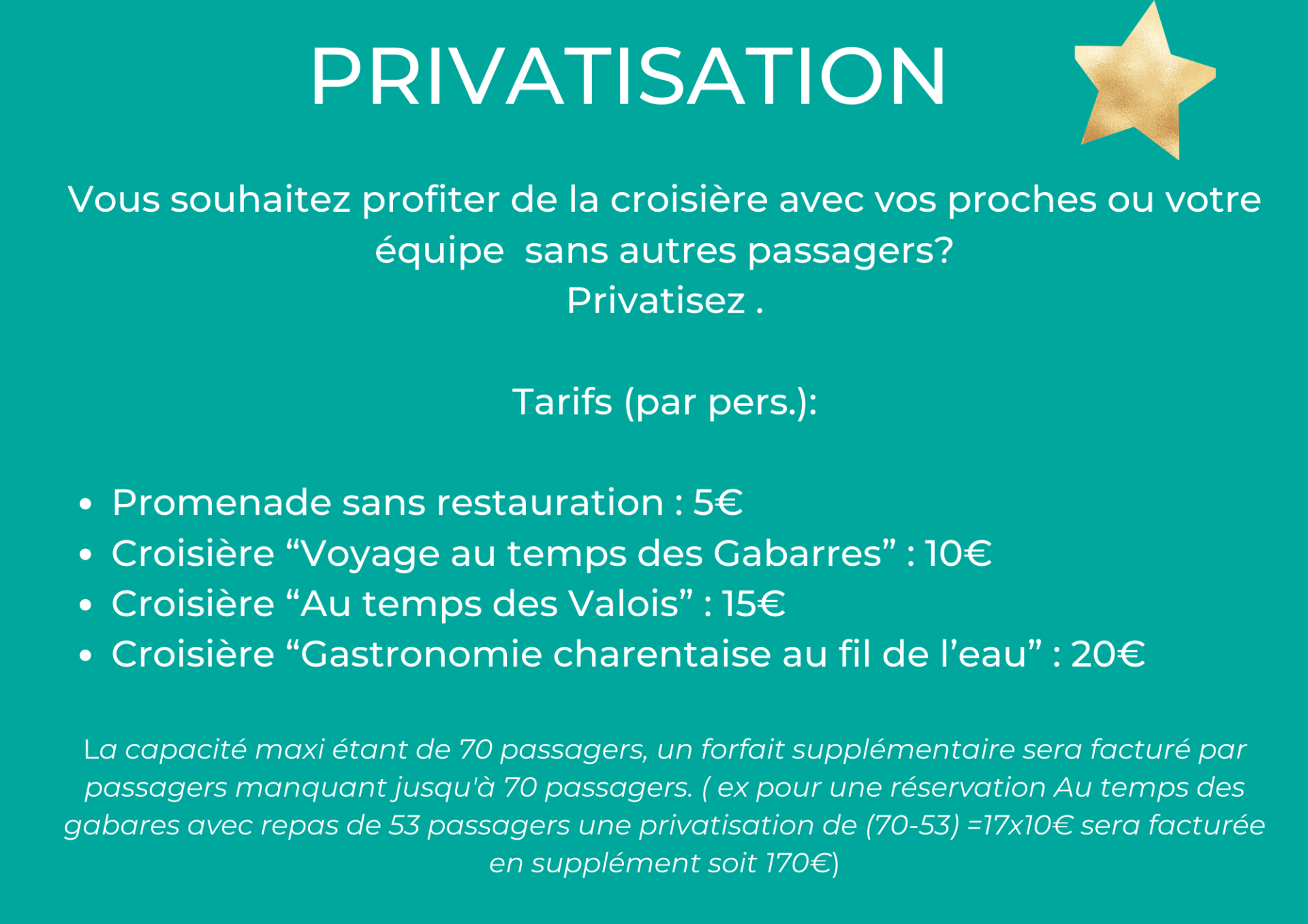 Embarquez à bord de la Reine Margot pour une croisière de 2h15 autour de mets traditionnels charentais. Laissez-vous porter au fil de l'eau sur les traces des gabarres et du passé marchand du fleuve Charente. Notre équipe vous attend pour vous faire passer un moment mémorable.